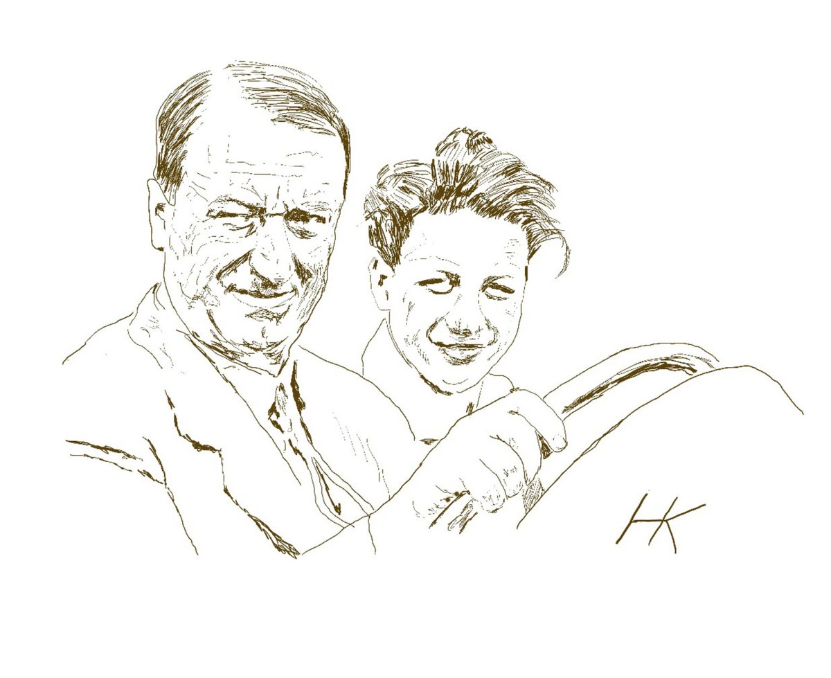 Having drawn the magnificent Bugatti engines, one is of course also fascinated by its creators. So I decided to make some detailed and realistic pen drawings of father and son – Ettore and Jean – on important occasions. The young Jean sits next to his father in 1924 at the Lyon Grand Prix, in a type 35. His father is then 43, and Jean is 15…
