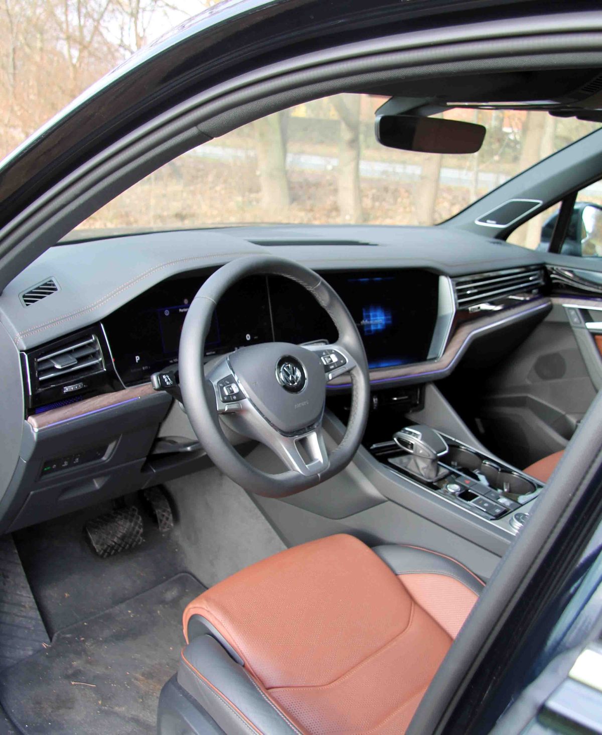 Indeed, the future has started, as soon as you slide behind the wheel and push the starting knob. VW calls it the “Innovision Cockpit.” A truly massive “Discover Premium” infotainment system (with 15-inch display) shines at you in the center, and it merges with the 12 inch display of the Digital Cockpit right in front of you. The unit hardly needs any conventional buttons or switches. And you can endlessly personalize it… so this becomes truly “your” Touareg.