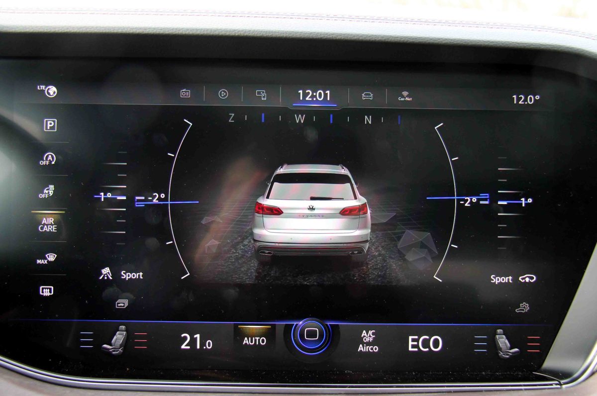 All the systems are connected via a new control unit, and include Roadwork Lane Assist (semi-automated steering and lane keeping, accelerating and braking up to 60 km/h), Front Cross Traffic Assist (reacts to cross traffic in front of the Touareg), active all-wheel steering (makes the Touareg handle like a compact car), new roll stabilisation with electromechanically controlled anti-roll bars, ‘IQ.Light – LED matrix headlights’ (interactive, camera-based dipped and main beam headlight control). All the systems, once selected, work in the background, and are totally intuitive to select and handle.