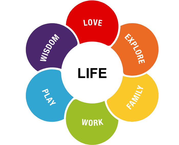Its central focus is (your) life in all its aspects and phases, beginning with love, then exploring, (founding a) family, work, play, and finally wisdom. With Love and Exploring as focus,