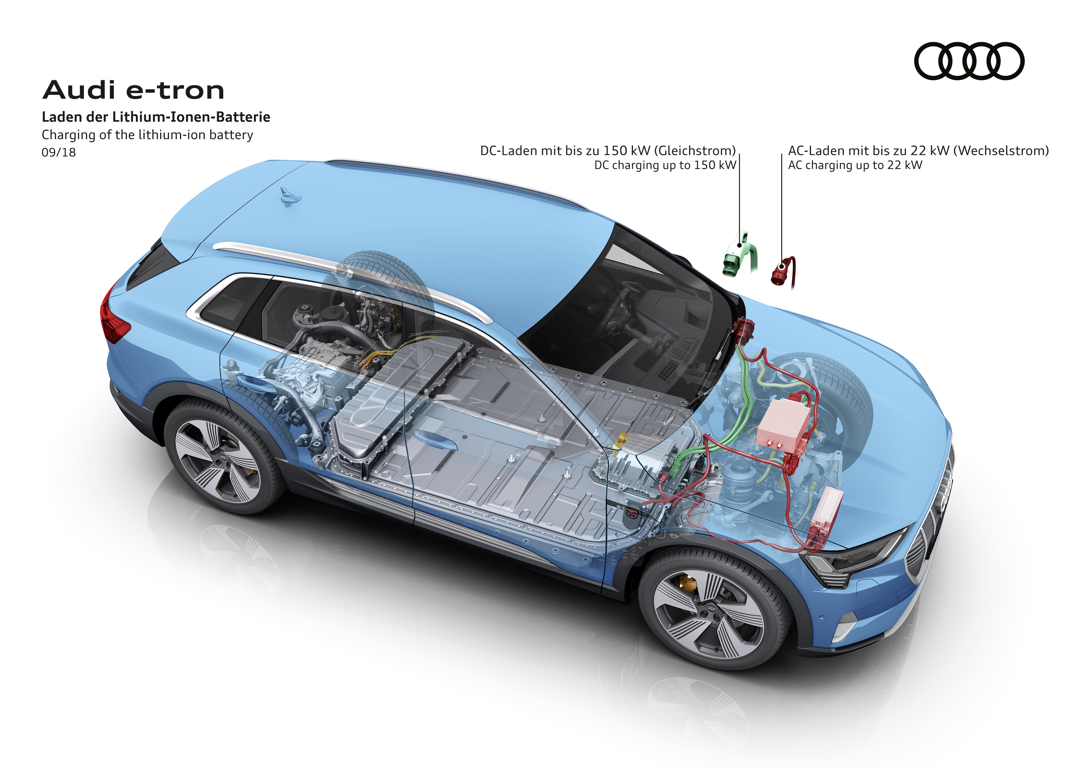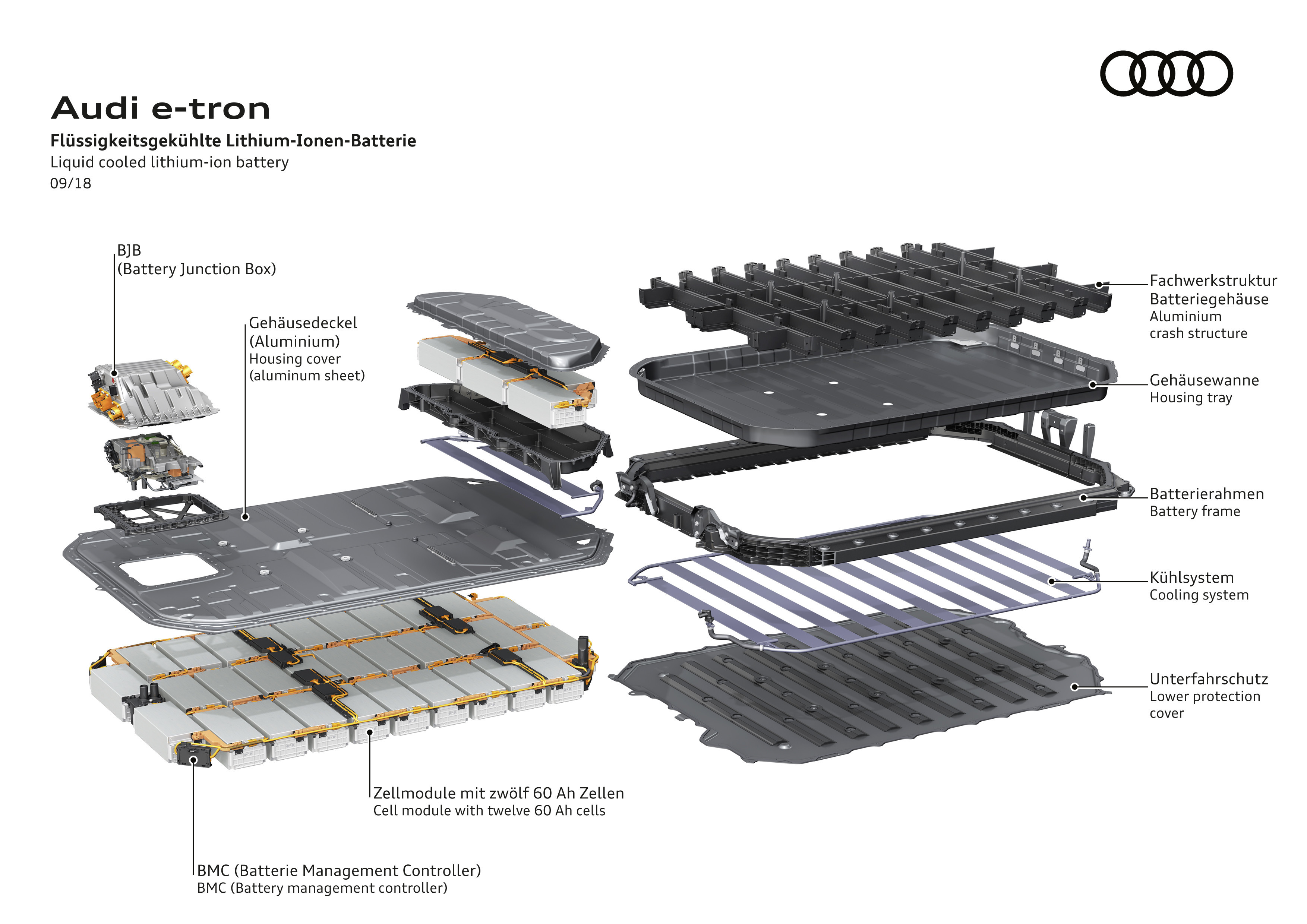 Including the housing with its sophisticated crash structures comprising 47 percent extruded aluminum sections, 36 percent aluminum sheet and 17 percent diecast aluminum parts, the battery system weighs around 700 kilograms (1,543.2 lb). It is bolted to the body structure of the Audi e-tron at 35 points. This increases its torsional rigidity by 27 percent and contributes to the high level of the safety of the Audi e-tron, as does the cooling system bonded to the outside of the battery housing. Compared to a conventional SUV, the Audi e-tron offers 45 percent higher torsional rigidity, a key parameter for precise handling and acoustic comfort…