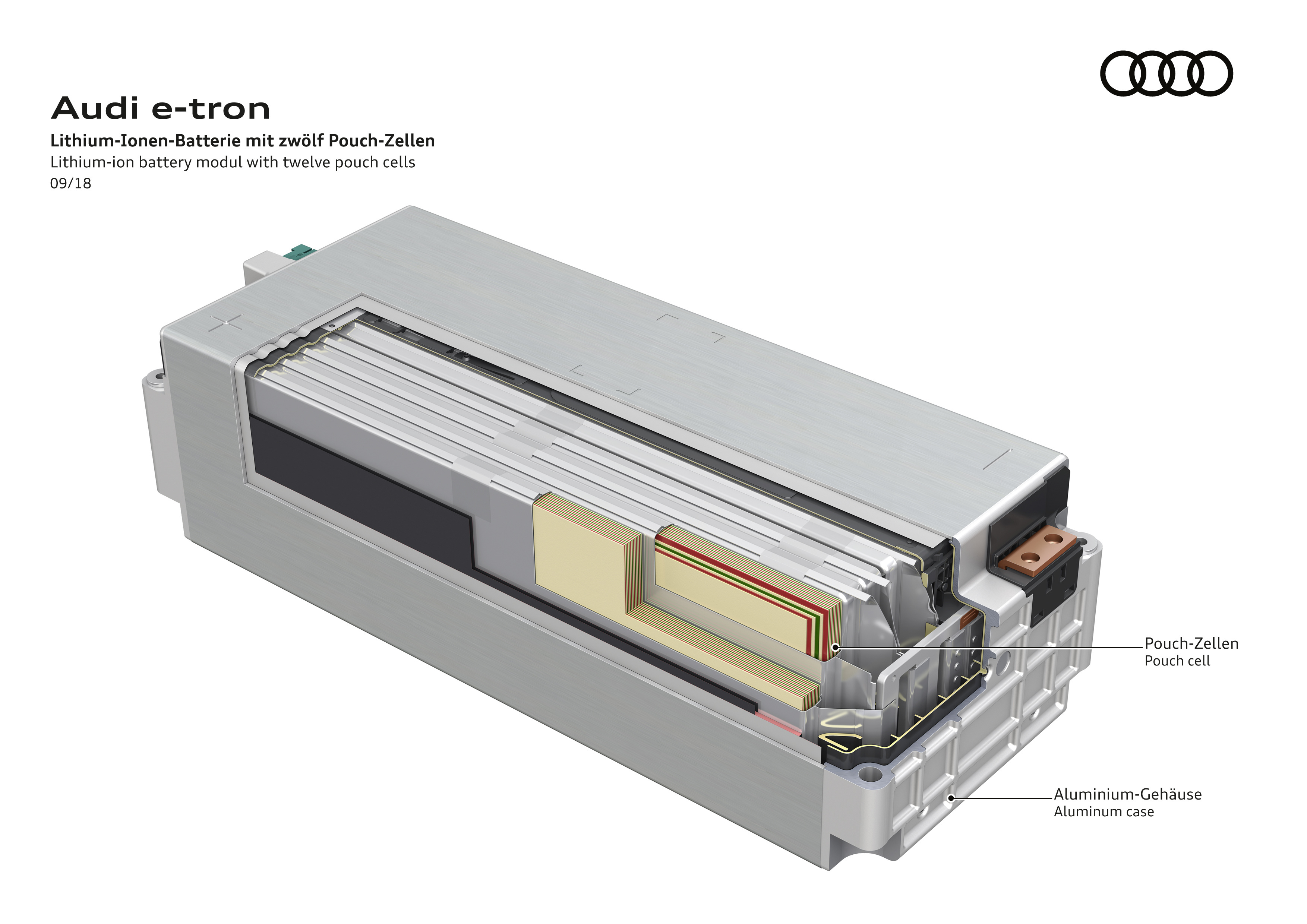 The cell modules in the Audi e-tron can reproducibly discharge and charge electricity over a broad temperature and charge status window. The can be densely packed to achieve a very high output and energy density in the volume available.