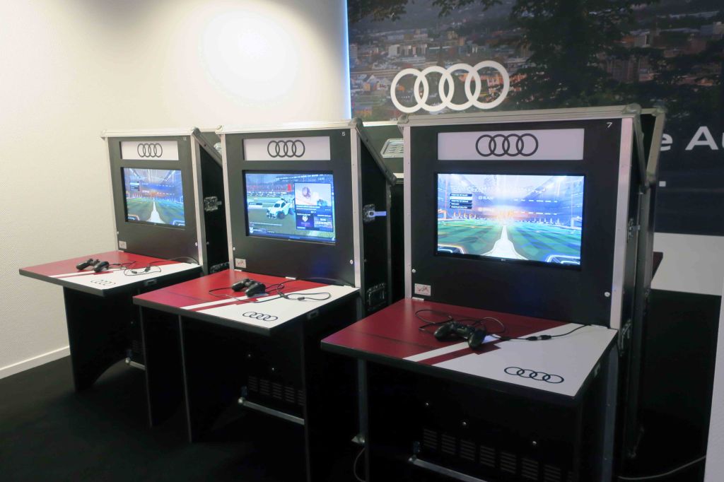 In the e-arena, esporters can play the “Rocket League” virtual racing football game on a real field. In this game, participants control an electric car developed for the occasion and try to score goals on a kind of soccer field.