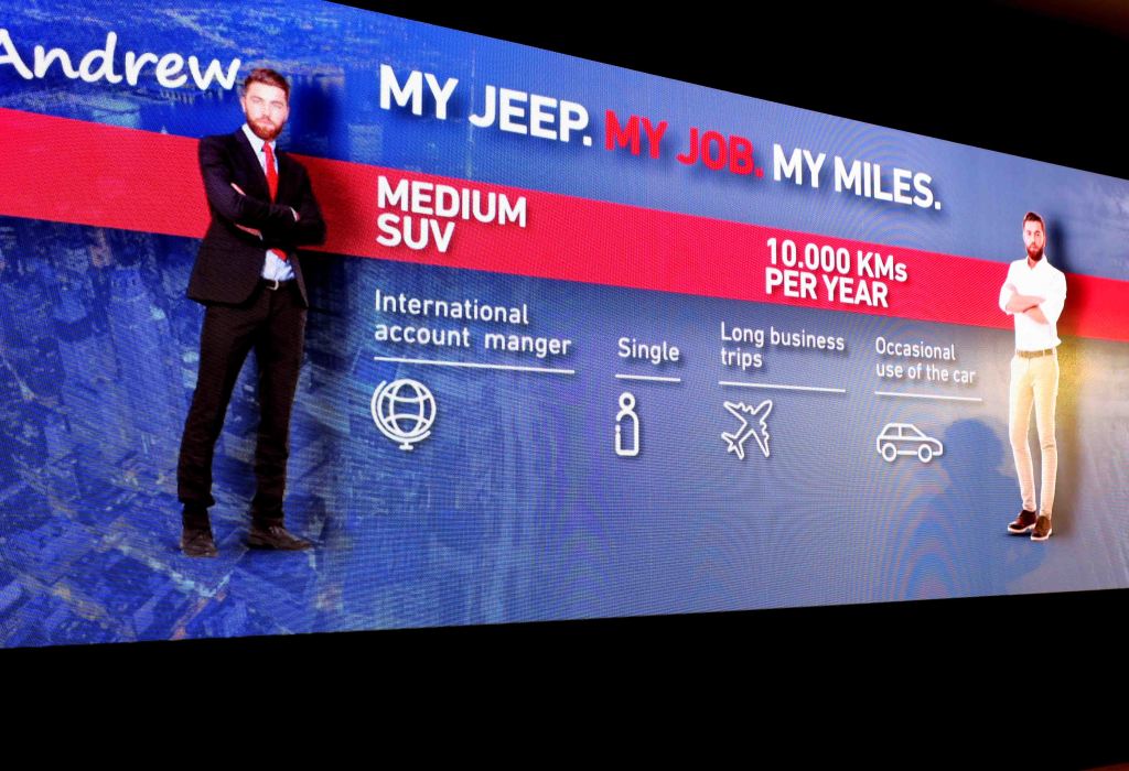Marcella Merli presented amongst others this typical example, seen here on the photographed slide, of Andrew, an international account manager, single, goes on long international business trips had occasionally uses his Jeep Compass on weekends.