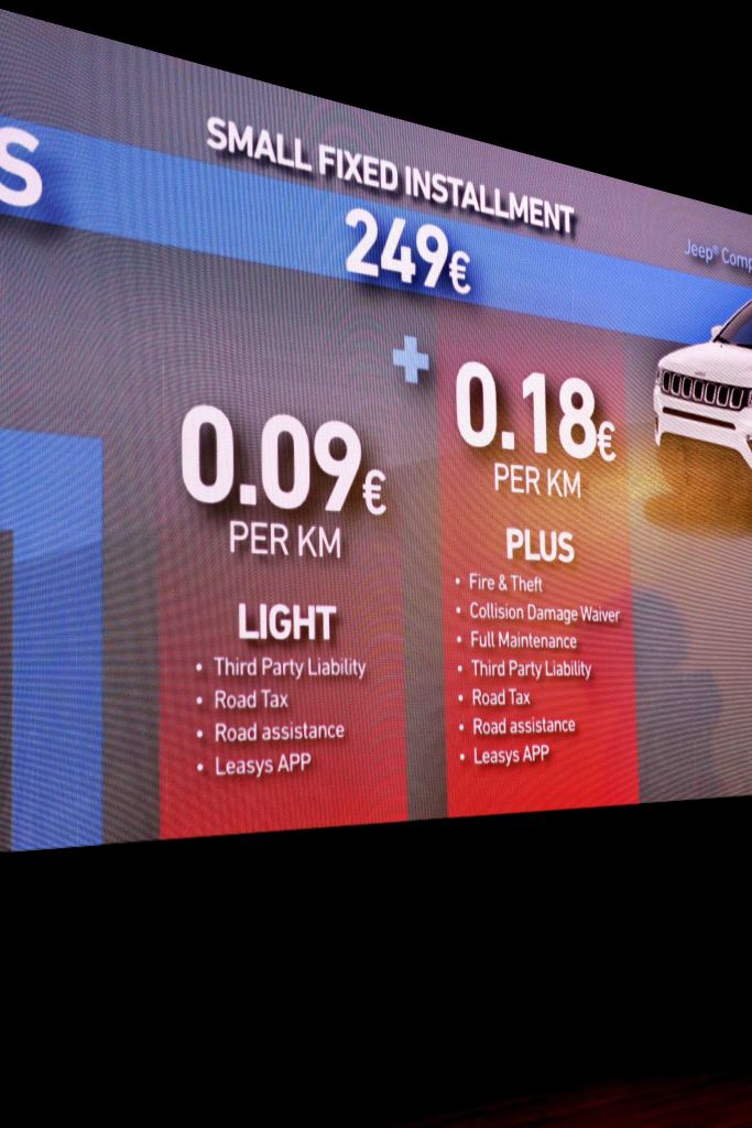 In his scheme, there is a small fixed instalment of 249 Euros, a “light” scheme of 0,09 Euro per km, including Third Party Liability, Road Tax, Road Assistance, the Leasys APP. The 0,18 Euro per km scheme includes further Fire & Theft, Collision Damage Waiver and last but not least Full Maintenance.