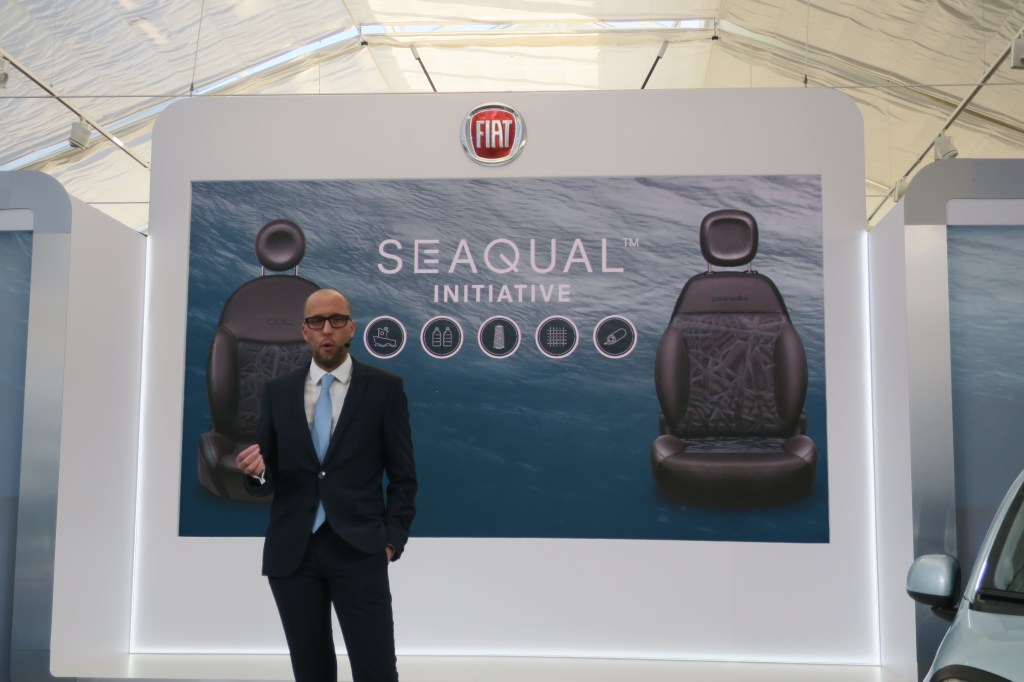 This SEAQUAL® YARN is produced by transforming plastics collected from the sea into flakes of polyethylene terephthalate. These flakes are then used in the yarn from which the fabrics are made. In the weaving phase, marine polyester is mixed with other environmentally friendly, natural, recycled or recovered fibers. This green process is completed by the application of dyes and environment-friendly finishes based on the saving of water and energy. Fiat is collaborating with SEAQUAL INITIATIVE to support ocean clean-ups to take action against marine litter.