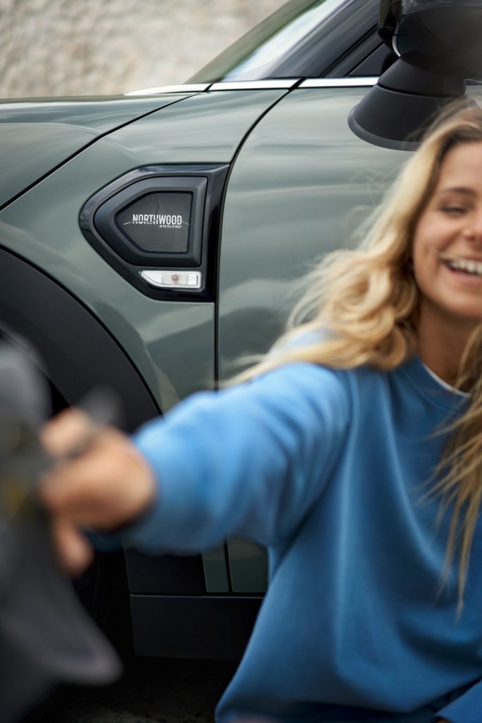 The MINI Cooper SE Countryman ALL4 Plug-In Hybrid Drive retains its typical air inlets at the sides of the car and has adapted sills in Electric Yellow. On top of the C-pillars a “Northwood” badge is also seen.