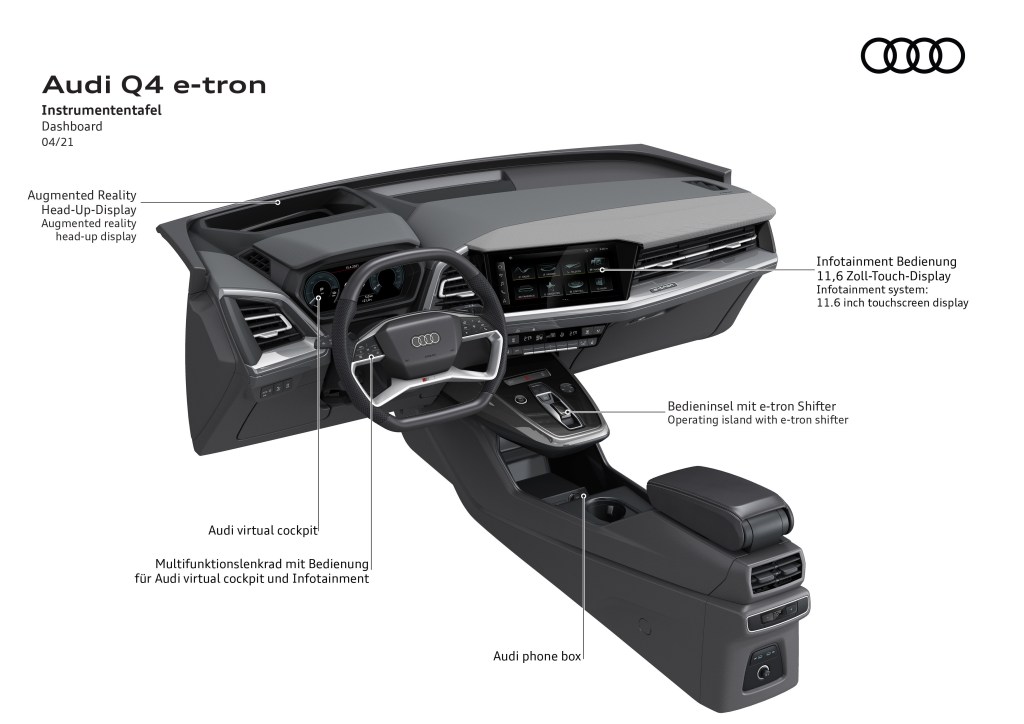 Audi wants its new Q4 line to be an all-round car which offers everything for everyone. The available space in the interior is comparable with the full-size SUV class; there is no center tunnel. The feeling of spaciousness is not just confined to the front seats – with the generous legroom, passengers in the rear also benefit from the advantage of the technological platform, which is designed as electric-only.