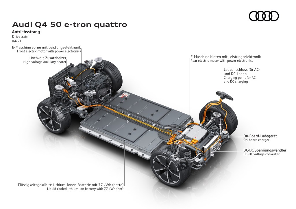 The drive portfolio of the two compact electric models lives up to the expectations of very different groups of customers – from the urban commuter to the long-distance driver. It includes two battery variants and three drive variants. The compact battery for the Q4 35 e-tron has a net energy content of 52 kWh (55 kWh gross), while the figures for the large battery in the Q4 40 e-tron and Q4 50 e-tron quattro are 77 (82) kWh.