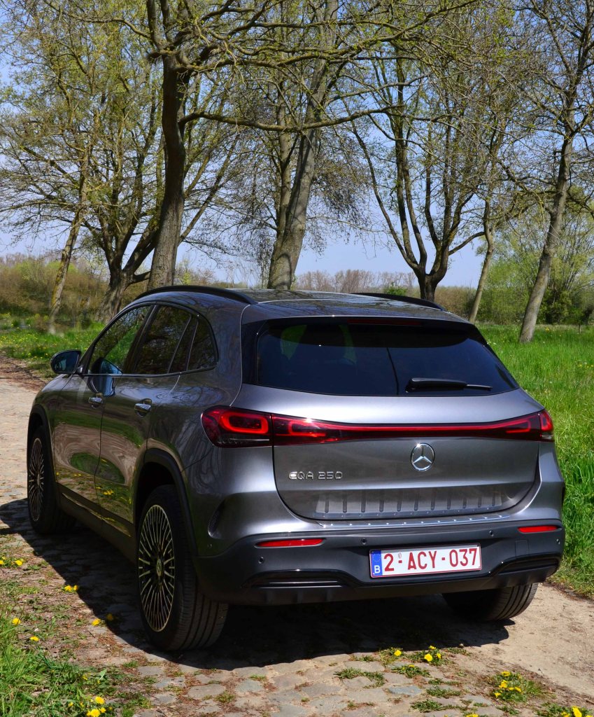The EQA gives good feedback of the road surface, but will not invite you with razor-sharp steering to throw it around corners. Driven with verve on winding roads it will keep its course admirably, albeit with some body roll. But the EQA is above all comfortable, with however the typical rather firm suspension setup which we encounter also in the other passenger cars and SUV’s from the brand.