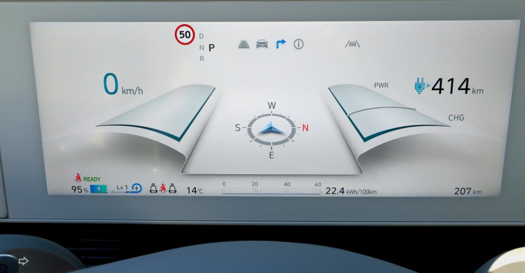 The Ioniq 5 has of course the usual driving modes, from Eco to sport, and you have also two paddles at the steering wheel which allow you to choose the degree of E-recuperation when you lift the throttle. During our test, we used mostly the level 3 position, which we felt delivered the right deceleration, and with some experience, we managed to drive around town and on the open road without ever touching the brake pad pedal at all…