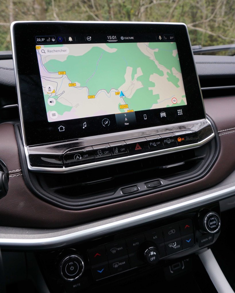 The new Compass combines the typical Jeep styling cues with well proportioned modernism, and indeed it pleases from any angle. Its dimensions are indeed “just right” for those customers who seek space and comfort, as we found out when we drove it on the narrow mountain and village roads in the Massif Central and Alpes Maritimes. Visibility of the edges of the car is greatly helped by the panoramic camera’s fore and aft, and one needs them indeed when maneuvering in narrow spaces.