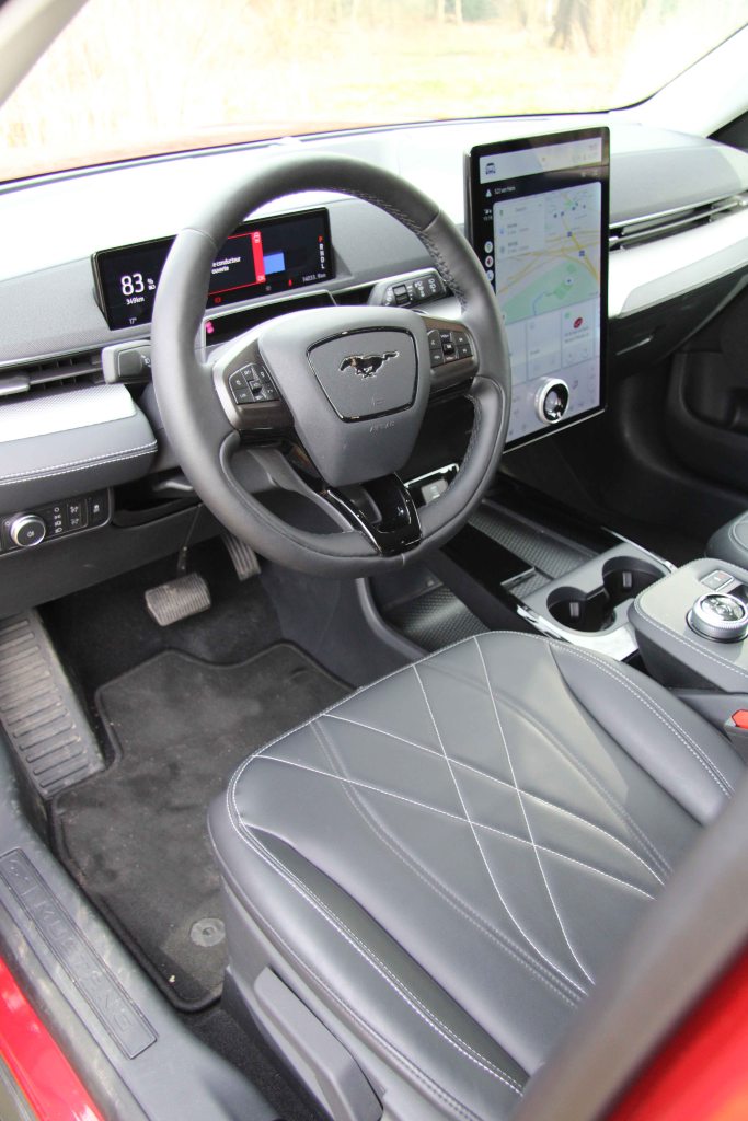 Fords are known for their very entertaining and pleasant road manners, and this Mustang is no exception. The Mustang Mach-E is built on the Global Electrified 1 (GE1) platform, which is a heavily reworked version of the C2 platform that is used on the fourth generation Focus and third generation Kuga/fourth generation Escape. It certainly performs well. The suspension in itself is quite comfortable, even on urban cobblestones, and certainly comes into its own on the open road. The low point of gravity and the 50/50 weight distribution does the rest: this Mustang effectively steers on rails. If your corner speed is somewhat too enthusiastic, it will gently understeer, but with the ample torque and pulling power under your right foot, it is very easy to balance the car with the throttle and even induce a smooth oversteer reaction. So yes, sporting driving pleasure is certainly to be had. Steering is precise, but the self centering reaction is quite noticeable, so grabbing the wheel firmly is “de rigueur” when you want to put this Mustang through its paces.