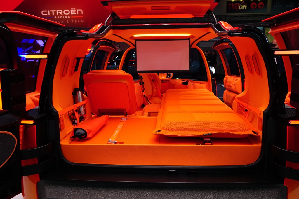“The third pillar is rest. You fold the seats in the back row, and you have a flat floor. You then use two matresses, again an innovation from Decathlon. You inflate them to have perfect rigidity. We also have a larger screen that can unfold and we have a projector that is on the side of the car, and the little roof opens up at the back of the car to let you look at the stars in the sky.”