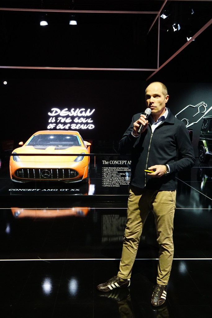 He started off with this AMG XX, and commented that this car embodies a rare combination a very aggressive sporting front end, the side view with the timeless proportion of the long bonnet, a very round shaped rear end and an amazing interior. He also showed the legendary Autobahnkourier, and he also focused on the grille of the 300 SLR Uhlenhaut Renncoupé, being so iconic and a typical design hallmark over the years for the sport coupés and cabrios of the brand. He also commented further on the Concept AMG that this car is the harbinger of what is to come for the series version of this AMG Electric sports coupé.