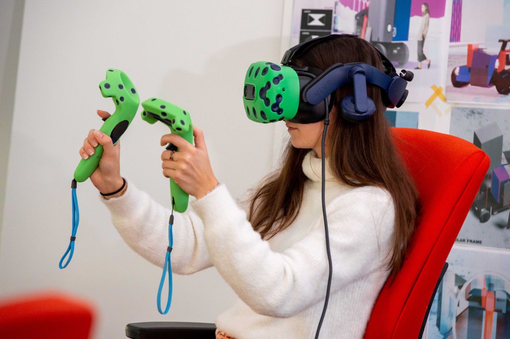 With the headset firmly on and plugged in, the designer is immersed in an entirely virtual 360° drawing studio. Using two controllers (one in each hand), they can then choose colours from a palette, draw lines, create shapes, fill surfaces, and much more. A computer program models and records each and every movement.