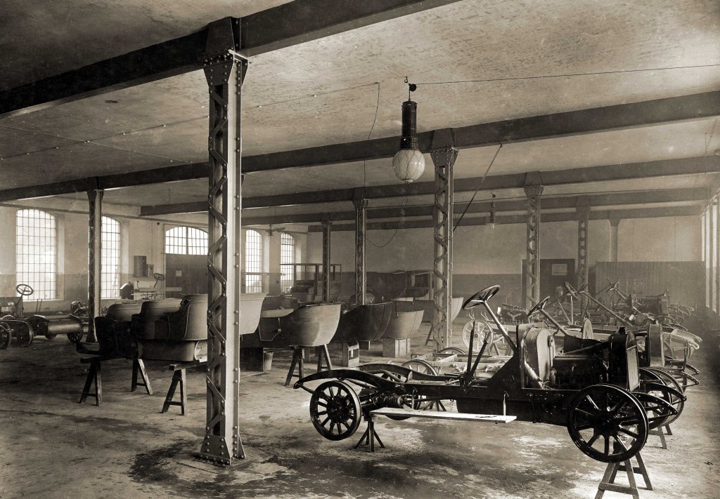 The “series” production of the sixth and last series of the Model “S”: cars and bodies were already on stands to make work easier…
