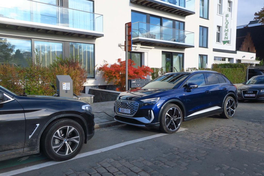 My nearest public charging point is about 1 kilometre away, and this is not a “fast” charging point. Allowed time for charging is also limited to 3,5 hours. Belgian municipalities – at least those near Antwerp – have still to wake up to reality that the charging points have TWO sockets and can actually charge two cars simultaneously. The square they paint on the pavement actually is clearly meant for ONE car. Users of the charging point are so kind and gentlemen-like to ignore this, so your servant could charge the Q4 too, as the following photo shows, which leaves one certainly perplex…