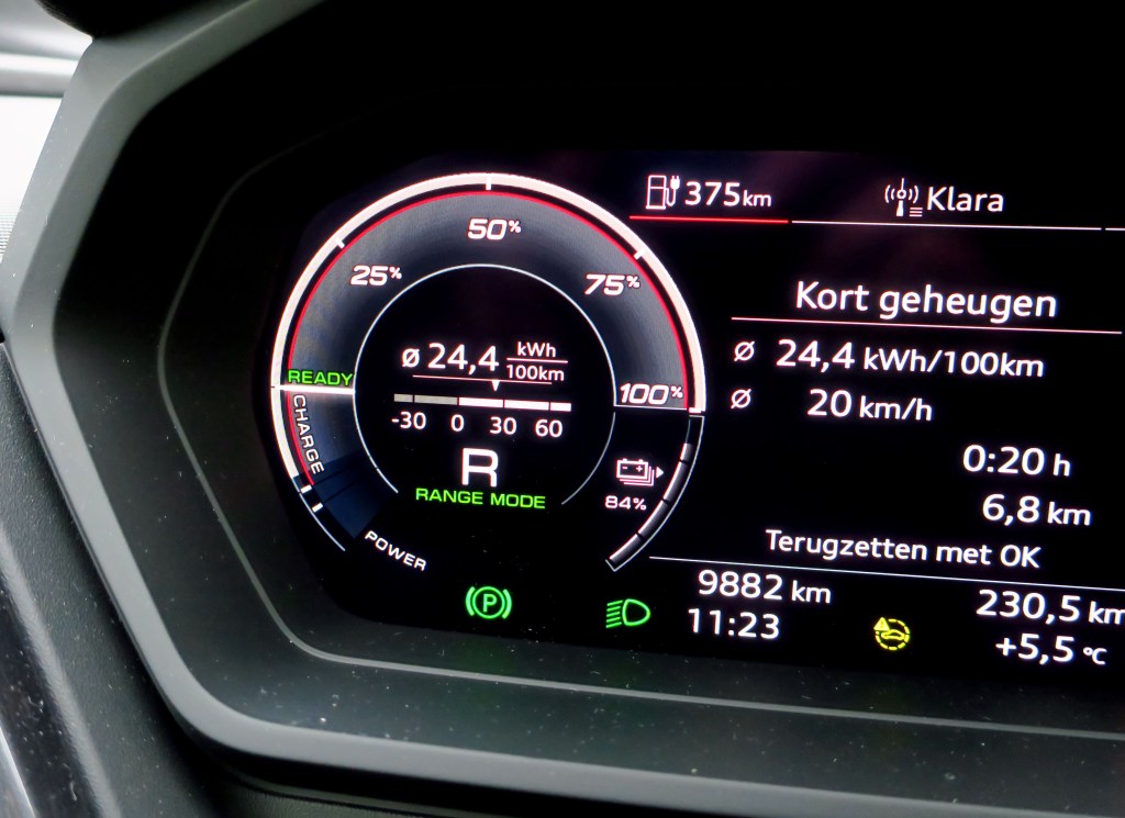 There are different driving modes on the Audi, one of them being the “Range” mode. It limits power and sets a maximum speed of 90 km/h.