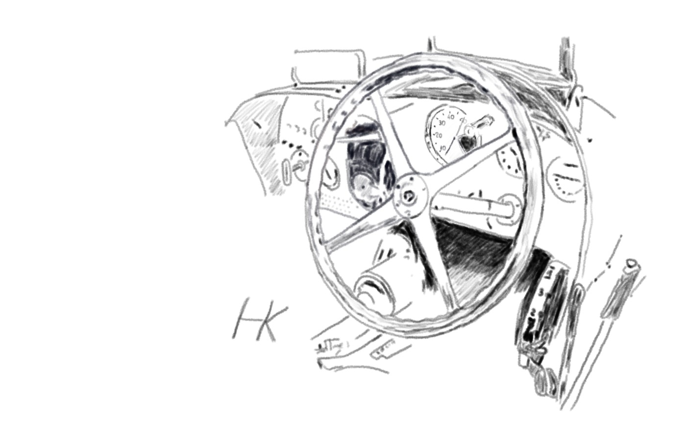 The pencil drawing – I used the 2B grade – shows the cockpit of the 51 “Voiture de Course”, with a very rare Cotal preselector gearbox. This was a manually controlled epicyclic box, as similar construction as the famous Wilson box. The difference is that instead of band brakes, it used electromagnetic clutches. Drivers could preselect the lower or higher gears under braking before or accelerating out of a corner, and it was seen on other French thoroughbred racing cars, like the Talbot Lago 4,5 liter monoposto for instance.
