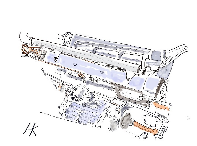 Here one sees the carburettor side of the engine, its architecture being an example for all Alfa engines to follow, right until this day… On both drawings, some watercolor was added.