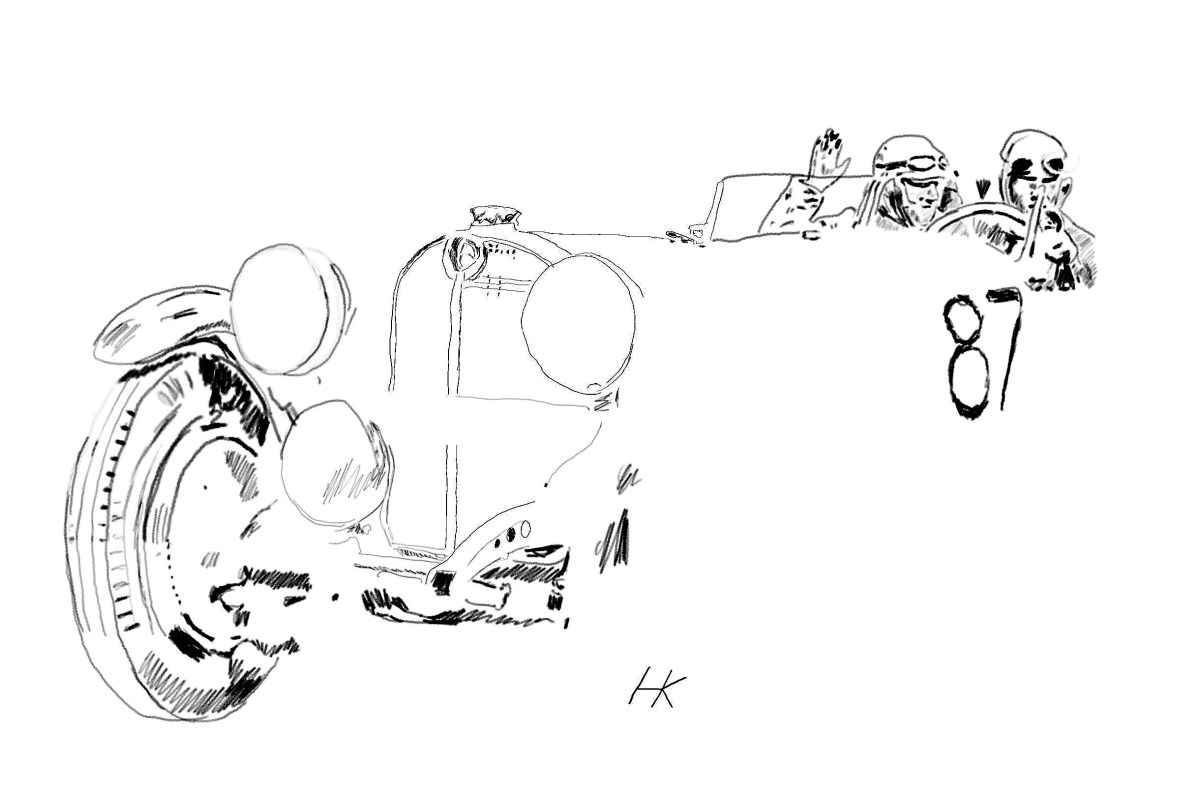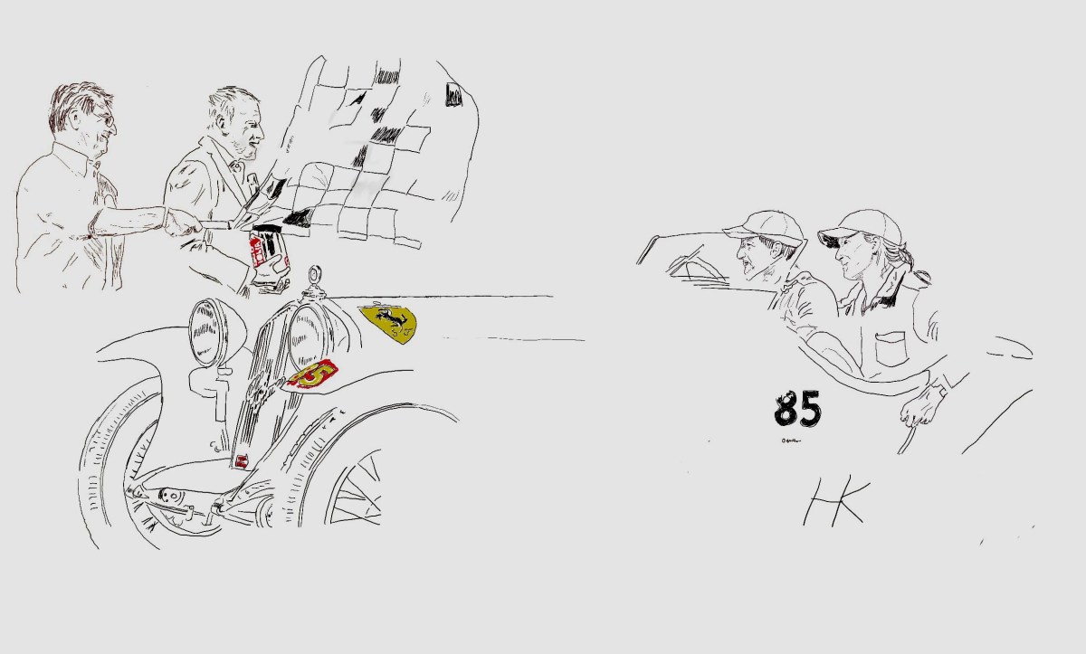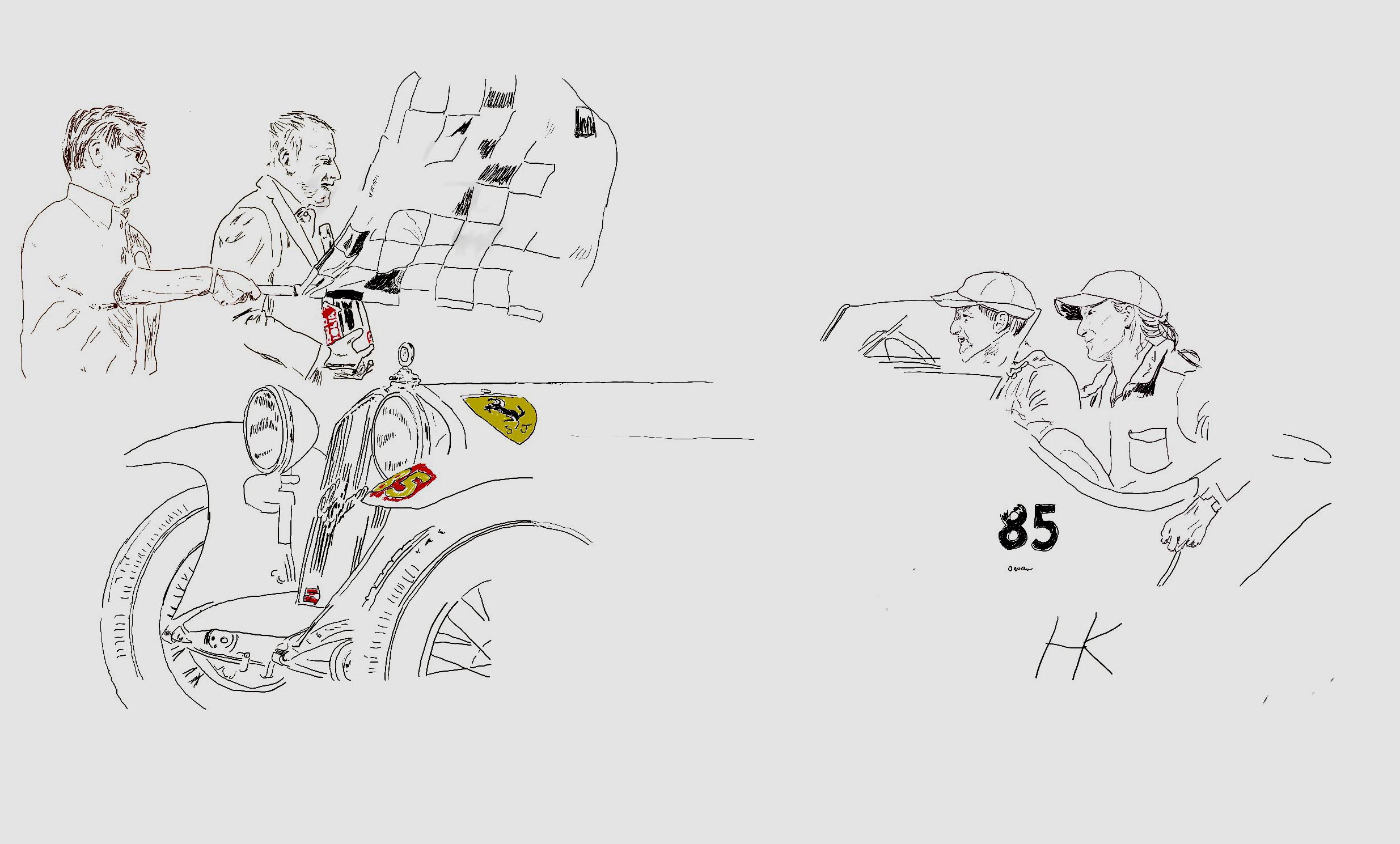 This is what the winners did, TONCONOGY Juan and RUFFINI Barbara, in their 1933 ALFA ROMEO 6C 1500 GS “TESTA FISSA”, starting number 85. You see them here on my drawing here joyously receiving the finish flag, with the second official presenting already the coveted champagne bottle. Miss Barbara Ruffini is already holding her left hand on the door to jump out of the car and collect her winner’s prizes.