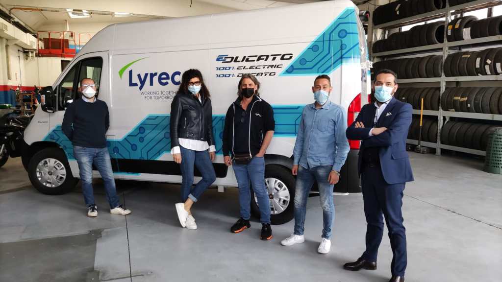 Angelica Carapezza, second from left, seamlessly adapting her dress code to the occasion, delivering the E-Ducato to customer Lyreco…