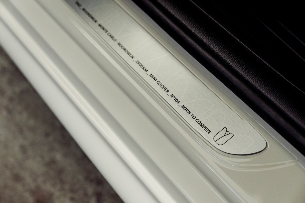 The key facts of the 1962 Tulip Rally appear below the side scuttles on the front side panels: the route Noordwijk – Monte Carlo – Noordwijk, the distance of 2 500 kilometres, the vehicle, namely a Mini Cooper, and its starting number 104. These are supplemented with the slogan that still applies to MINI to this day: “born to compete”. The tulip motif, the name inscription and the key facts about the first every rally win are also to be found on the screen-printed aluminium door sill trims designed exclusively for the edition model.